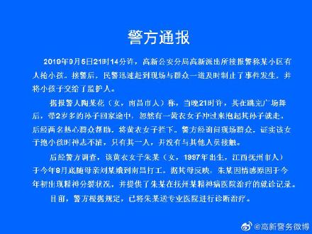 据报警人称,当晚21时许,其在跳完广场舞后,带2岁多的孙子回家途中,忽然有一黄衣女子冲过来抱起其孙子就走,后经两名热心群众帮助,将黄衣女子拦下。警方经询问现场群众。证实该女子抱小孩时神志不清,只有其一人,并没有与其他人员接触。后经警方调查,该黄衣女子朱某(女,1997年出生,江西抚州市人)于今年8月底随母亲刘某娥到南昌打工。据其母反映,朱某因情感原因于今年初出现精神分裂状况,并提供了朱某在抚州某精神病医院治疗的就诊记录。日前,警方根据规定,已将朱某送专业医院进行诊断治疗。