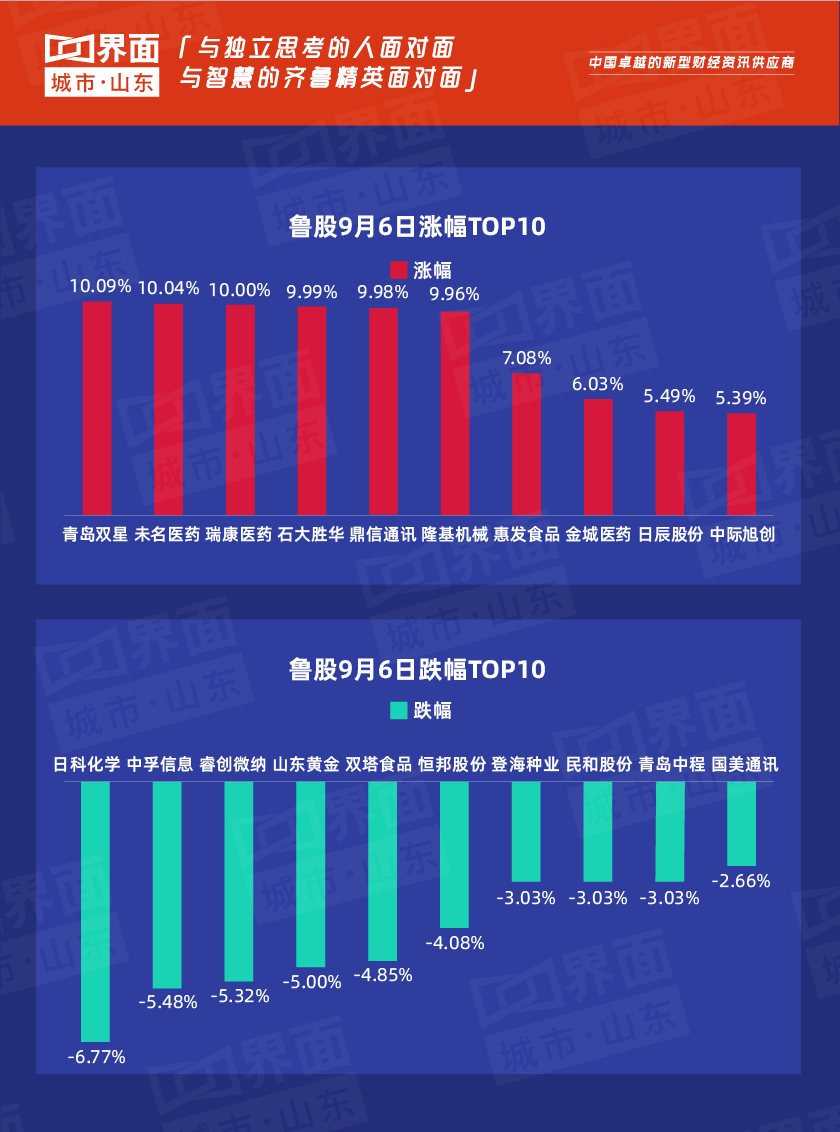 9月6日,山东省内沪深股票有122只个股上涨,73只下跌,11只与上一个交易日收盘价持平;青岛双星(000599)涨停领跑山东板块;此外,山东板块交易日还有未名医药、瑞康医药、石大胜化涨停。