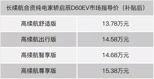 同时考虑到出租车、网约车市场发展迅速,运营车辆电动化已成大趋势。在此市场环境下,东风启辰特推出高续航出行版,售价14.58万,提供5年50万公里的电池组质保,配置也做了优化,以满足出行市场的需求。