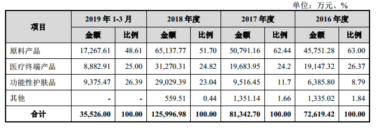 华熙生物主要产品有原料产品、医疗终端产品、功能性护肤品等。2018年华熙生物的综合毛利率为79.92%,2019年一季度的综合毛利率也有77.52%。
