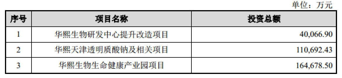 此番华熙生物拟募资31.54亿元,资金投向研发中心提升改造项目、华熙天津透明质酸钠及相关项目、华熙生物生命健康产业园3个项目,投资金额分别为4亿元、11亿元、16.47亿元。