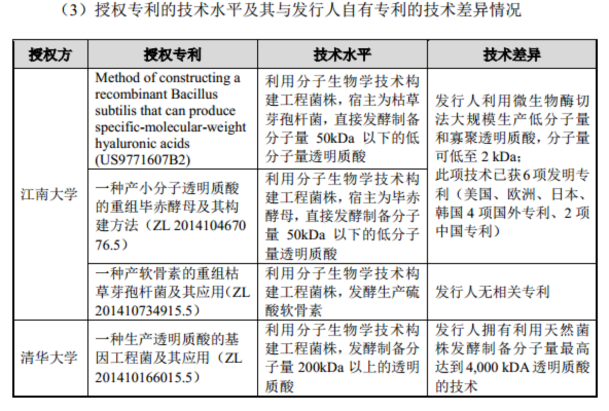 除了山东省生物药物研究院之外,华熙生物2018年10月与江南大学签订《专利实施许可合同》,双方约定江南大学授权发行人使用与透明质酸、软骨素相关的三项专利,许可方式为独占使用,许可期至2034年9月11日。