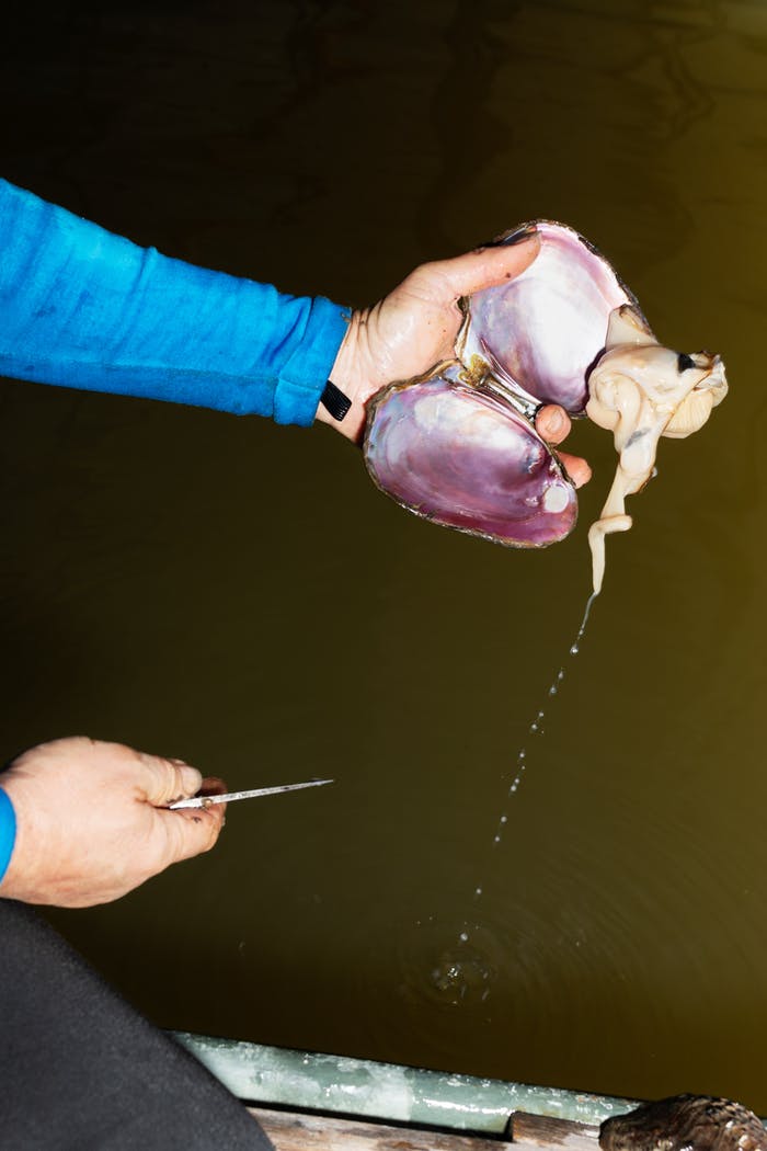 参与珍珠采集的并不都是专业人士。“在最红火的那几年,有的妇女在早上送完孩子上学、目送丈夫上班之后,会提上一个五加仑、有把手的那种塑料桶,换上泳衣,然后踏进齐腰深的水里去抓河蚌,”基斯特说,“她一桶能卖40,50或者100美元,一次大概能捞两三桶。我们叫它‘脚趾捕捞’。这活儿谁都能做。”