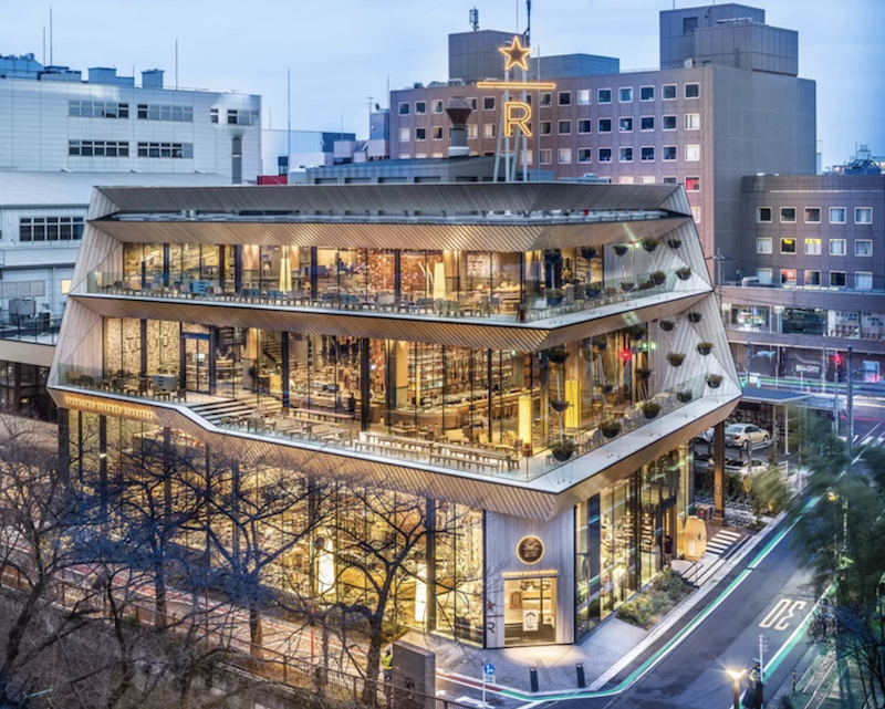 比如2017年开业的上海门店位于南京西路的兴业太古汇商圈,内部有用顶级核桃木制作的长27米的世界最长咖啡吧台;而今年3月开业的东京门店则由著名设计师隈研吾操刀设计,除了店内横贯而下的黄铜樱花,还有可以看到中目黑景色的赏樱观景座位。