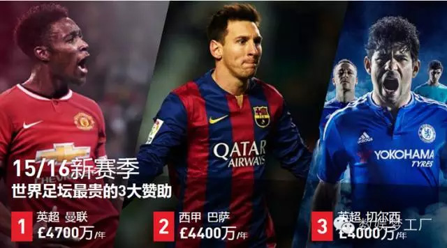 2015/2016新赛季里,世界足坛最高的三大赞助里,2家是来自英超,排次分别是1.曼联(4700万英镑/年)、2.巴萨(4400万英镑/年)、3.切尔西(4000万英镑/年)。