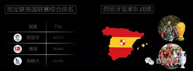这一数据对比上面那组,可以说非常的有意思。数娱君认为:从商业化程度上说,英超目前是不折不扣的全球第一联赛,它的每一个毛孔里都能透出金钱。但从足球联赛的竞技化水准、以及欧洲冠军杯获得的数量而言,西甲都是当之无愧的“带头大哥”。