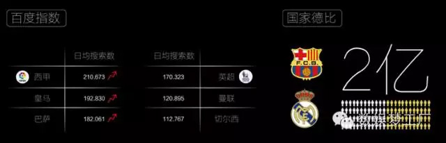 皇马和巴萨两大豪门无疑是整个西甲联赛最大的财富,根据百度指数的统计,在日均搜索方面,皇马的搜索量为19.28亿,巴萨的搜索量为18.21亿,相比之下英超的两大头牌,曼联和切尔西的搜索量分别只有12.09亿和11.28亿,相比西甲两大豪门的热度少了至少30%以上。