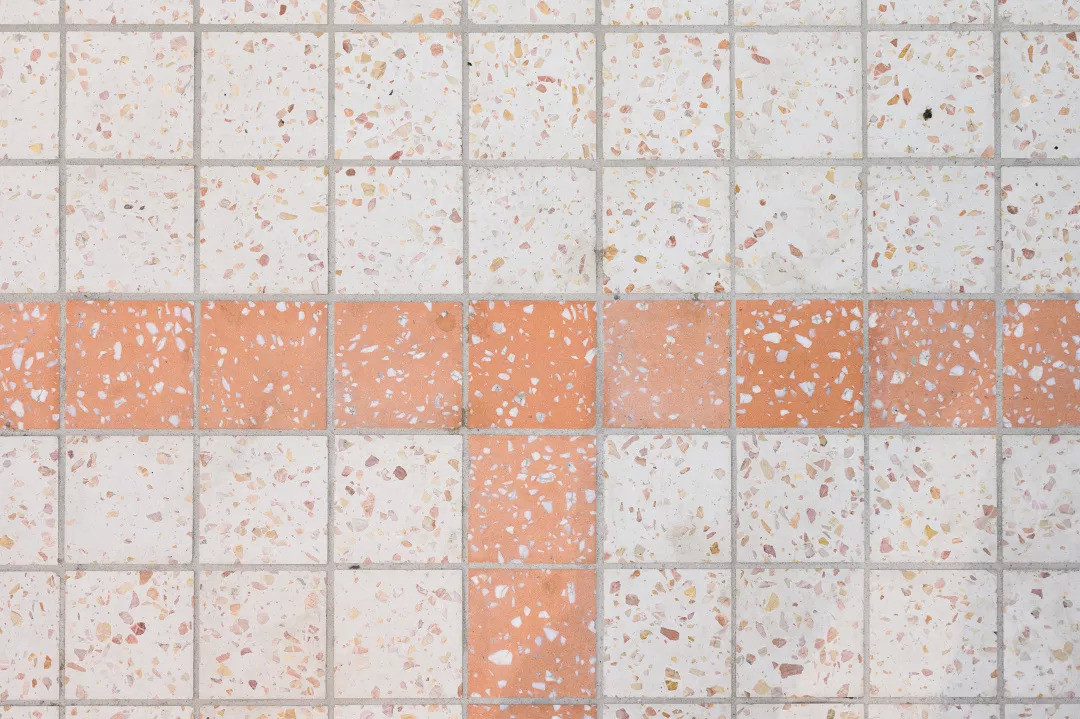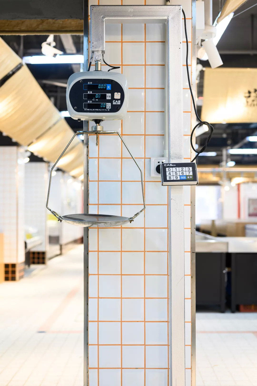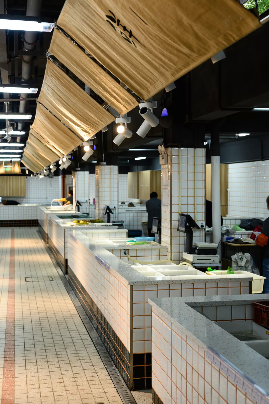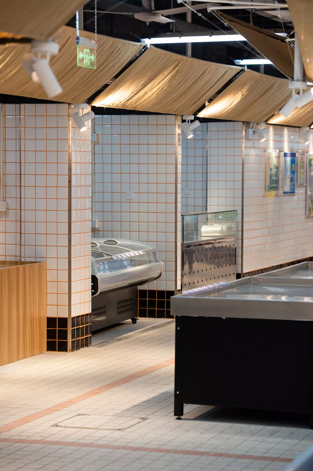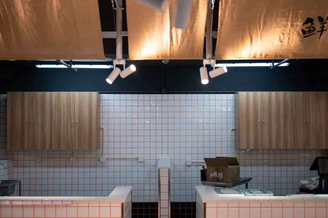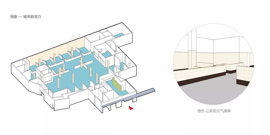 空间主材质的选定,也是基于成本及后续运营所考量的。自洁,卫生,经济以及菜场规范要求,导致了“白方砖”成为唯一一种业主认可的立面铺装材料。但我们还是在砖的缝隙上做了设计:将原本的黑灰缝改编成为橙色缝,当每一条橙色缝隐在空间中但又发挥着其“鼓舞人心”的能量之后,整体空间一下子从黑白色的沉闷,转向“视觉跳动”,但由于是缝隙的细微,并不会影响整体空间的洁净与明亮。