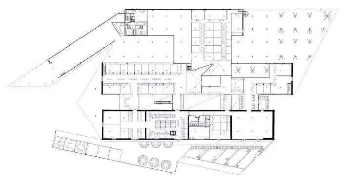 前方室外市场的两侧分别是早市广场和夜市广场,二者的名字分别指代了一天当中最好的两段时间。两个广场通过缓坡和露台彼此连接,并在两侧设置有用于餐饮和休息的休闲区、供孩子们玩耍的游乐场和服务于咖啡馆及餐厅的室外露台。