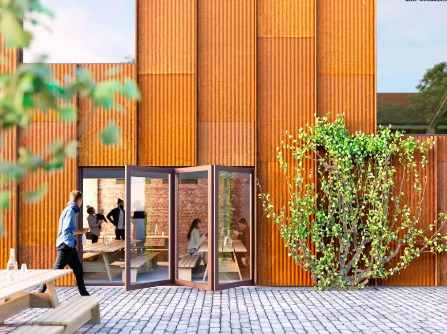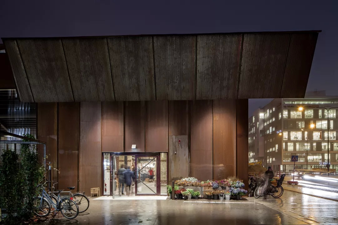 将当时连屋顶都没有的空壳建筑改造成供大约20个商户和餐馆使用的市场,设计师在原有建筑的基础上模仿它的山墙轮廓进行扩建,为了保留该建筑原有的工业特征,他们使用了红色锈面的波形钢片。“扩建的立面是合理的,使用标准化的波纹钢与突出的、垂直的钢型材相结合,使立面在窗框和门廊上具有节奏和稳定性。”项目建筑师解释说。