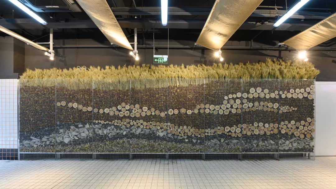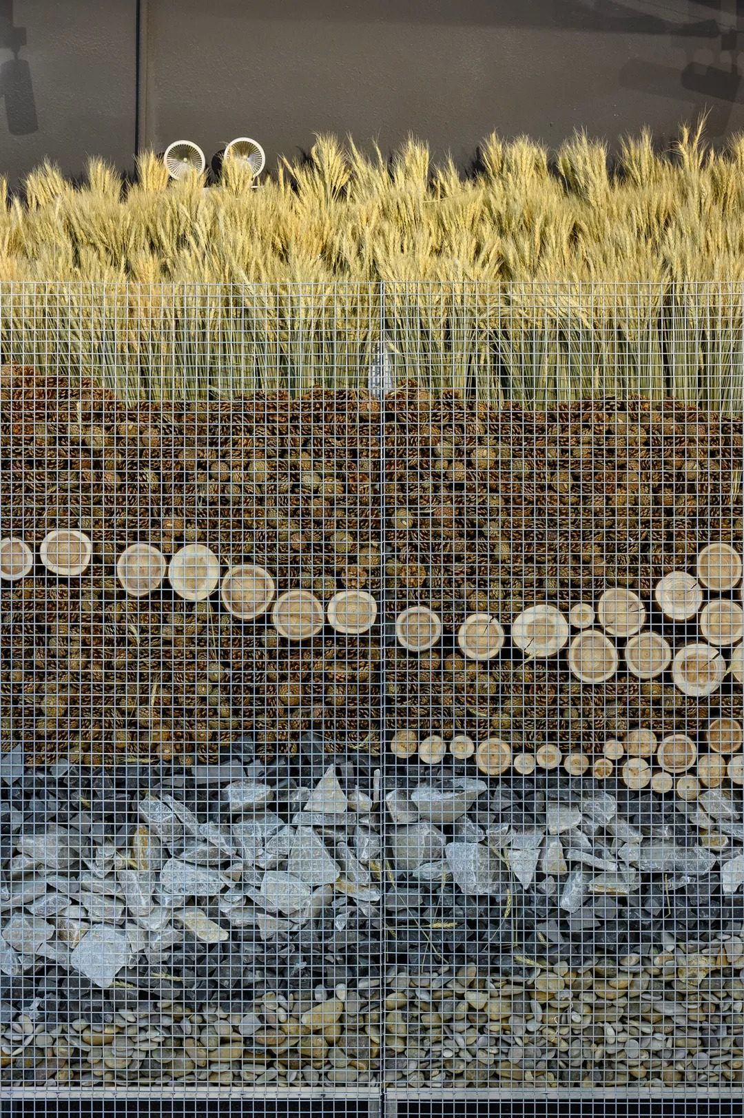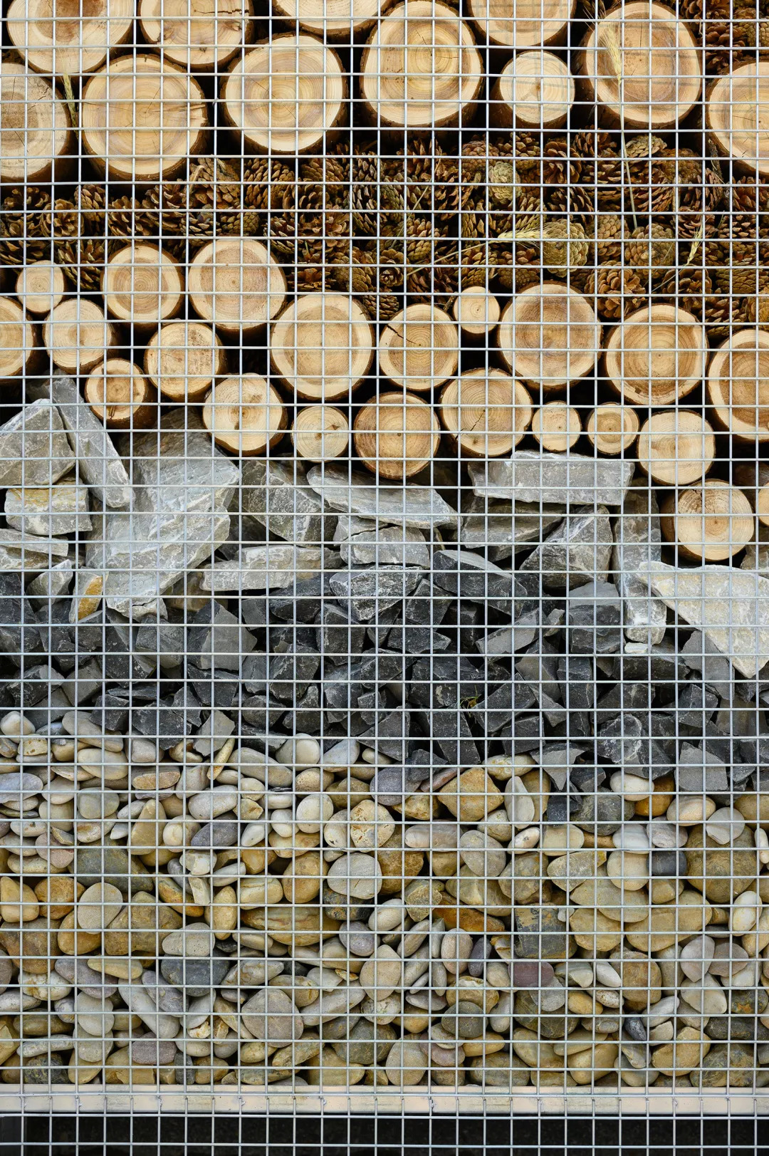 用 “石笼”的景观立面做法,影射“城市乡野”的入口仪式感。将石头替换成更有机的,“松果”,“麦穗”,“松木”,“卵石”,来重新拼合出一组“断层地质图”。这样的氛围营造的尺度感,在于对材料本身的研究,自然有机物永远不会带来距离感。