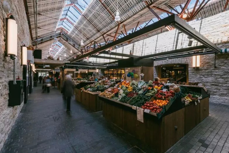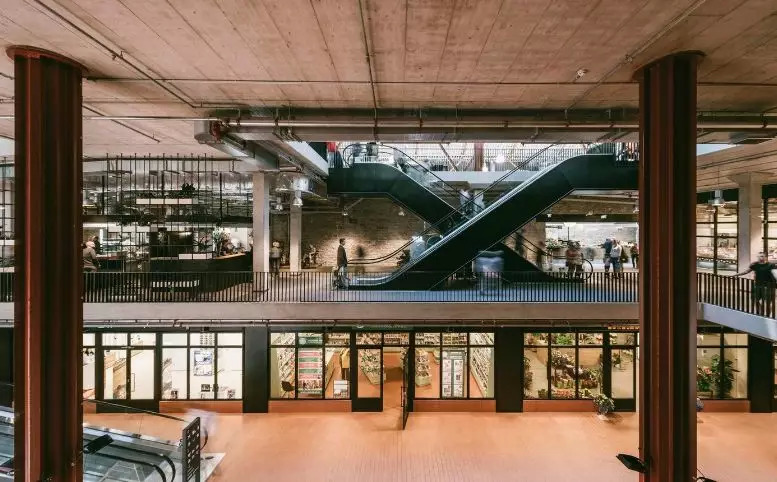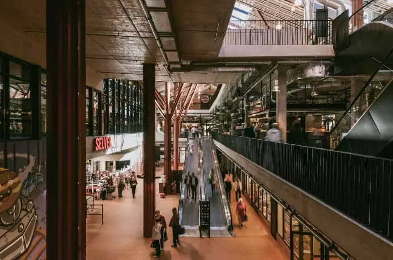 就是建筑内部而言,主要力量集中在如何展示原有市场的历史性和如何有意识地避免创造全新的历史细节上。建材的色调通过各种颜色的砖和与砖大小相同的瓷砖颜色组成。商店的正面和栏杆采用木材和黑金属制造。总体照明采用温暖而稳重的色调,在需要的情况下,特定货品和商业则采用特定的照明模式。