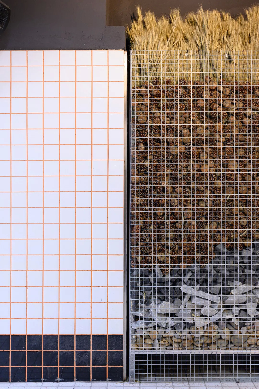 入口的“石笼”的景观立面影射“城市乡野”的仪式感。将石头替换成更有机的松果、麦穗、松木、卵石等重新拼合出一幅断层地质图。石笼里的干蒸松木自身散发出来的木质清香,也是裸筑臆想中的嗅觉上的仪式感,伴随着视觉的体验与水果铺的入口功能,共同创造感知上的“城市乡野”。