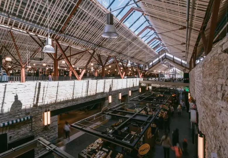 市场的主立面由三个两层高的石灰石仓库(始建于1870年)组成。主要扩建部分则包括用于容纳新功能空间的地下室和一个独立的统一式坡屋顶,其形状遵从原有房屋的形状和尺寸设计。