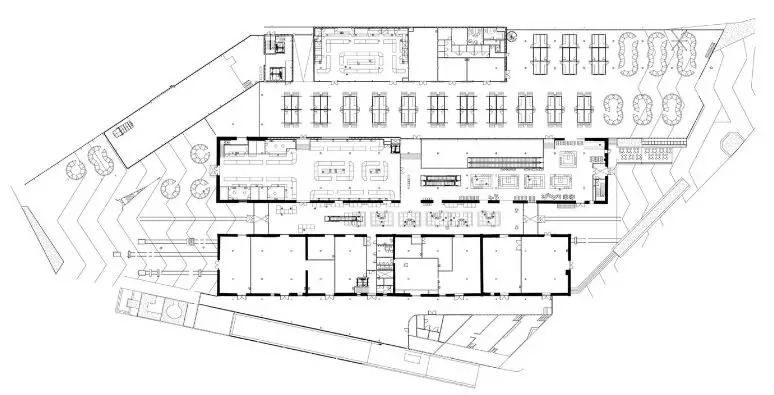 市场首层平面的主要目标是渲染出一种熙熙攘攘的的买卖氛围。这种理想中的环境通过集结各种市场形式并将其聚集于一层内的方式达成。市场中的经典功能模块是售卖肉类、鱼类和奶制品的小摊位,它们与农贸市场、蔬菜摊和中央大街上的街边食品街并排站在一起。将这些功能整合在一起之后形成了一个全新的体验波罗的海车站市场的方式。