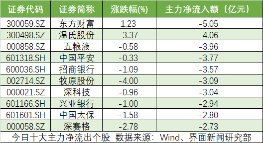 沪深两市共计43只个股主力净流出额超1亿元。东方财富(300059.SZ)、温氏股份(300498.SZ)、五粮液(000858.SZ)主力净流出额位居前三,分别为5.05亿元、4.06亿元、3.96亿元。