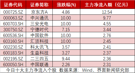 剔除尚未开板的新股及科创板股票,全天沪深两市主力净流入额超过1亿元的个股数量为48只。京东方A(000725.SZ)、中兴通讯(000063.SZ)、三安光电(600703.SH)的主力净流入额位居前三,分别为12.54亿元、9.77亿元、4.55亿元。