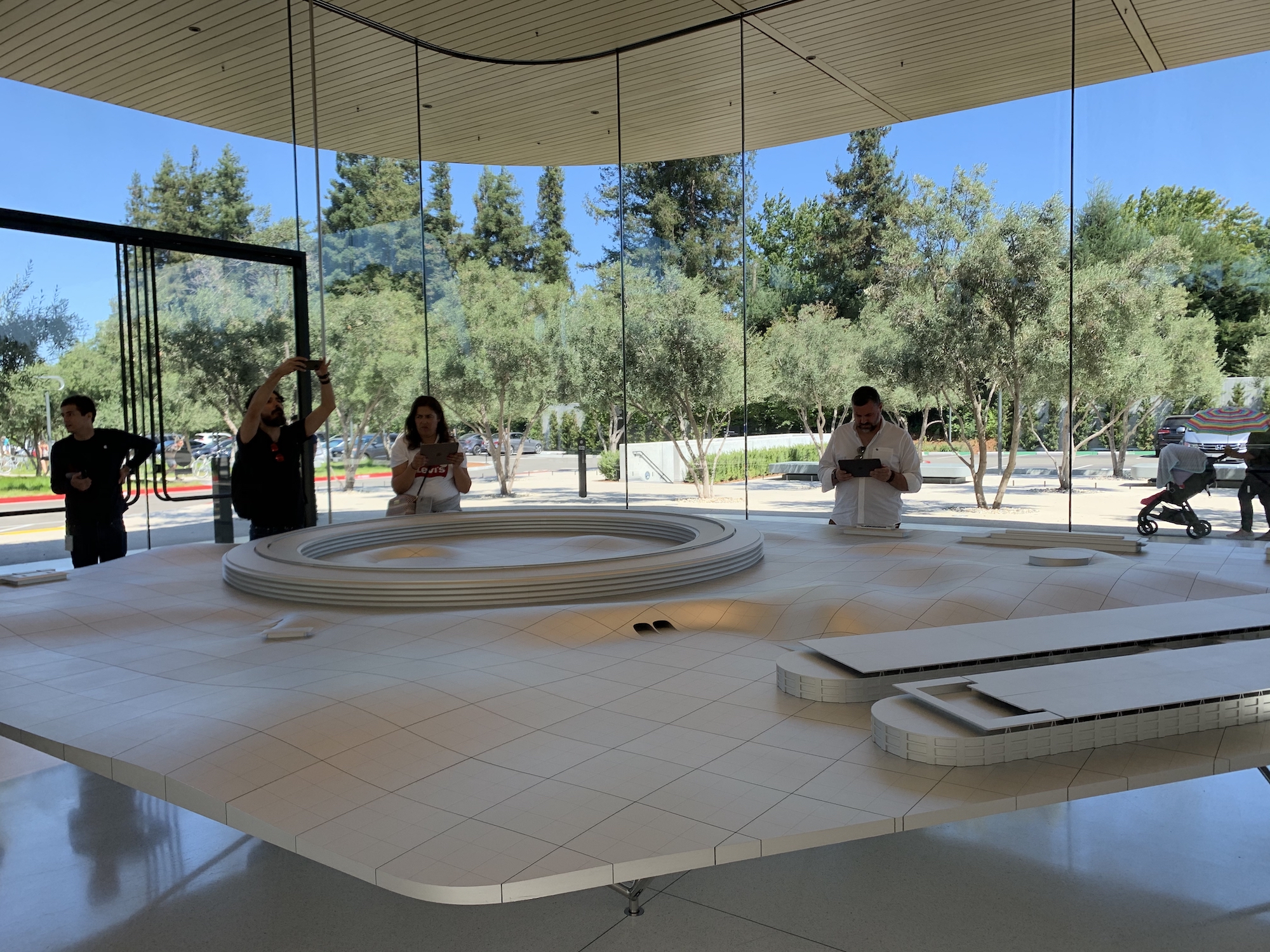 通过一台定制iPad上的AR软件对准沙盘模型,可以模拟出真实场景下Apple Park的全貌。你甚至可以通过调整时间来查看太阳位置变化下Apple Park的不同景观,亦或是查看乔布斯剧院的内部细节构造。通过AR的形式,可以让Apple Park的更多细节展现在你眼前。