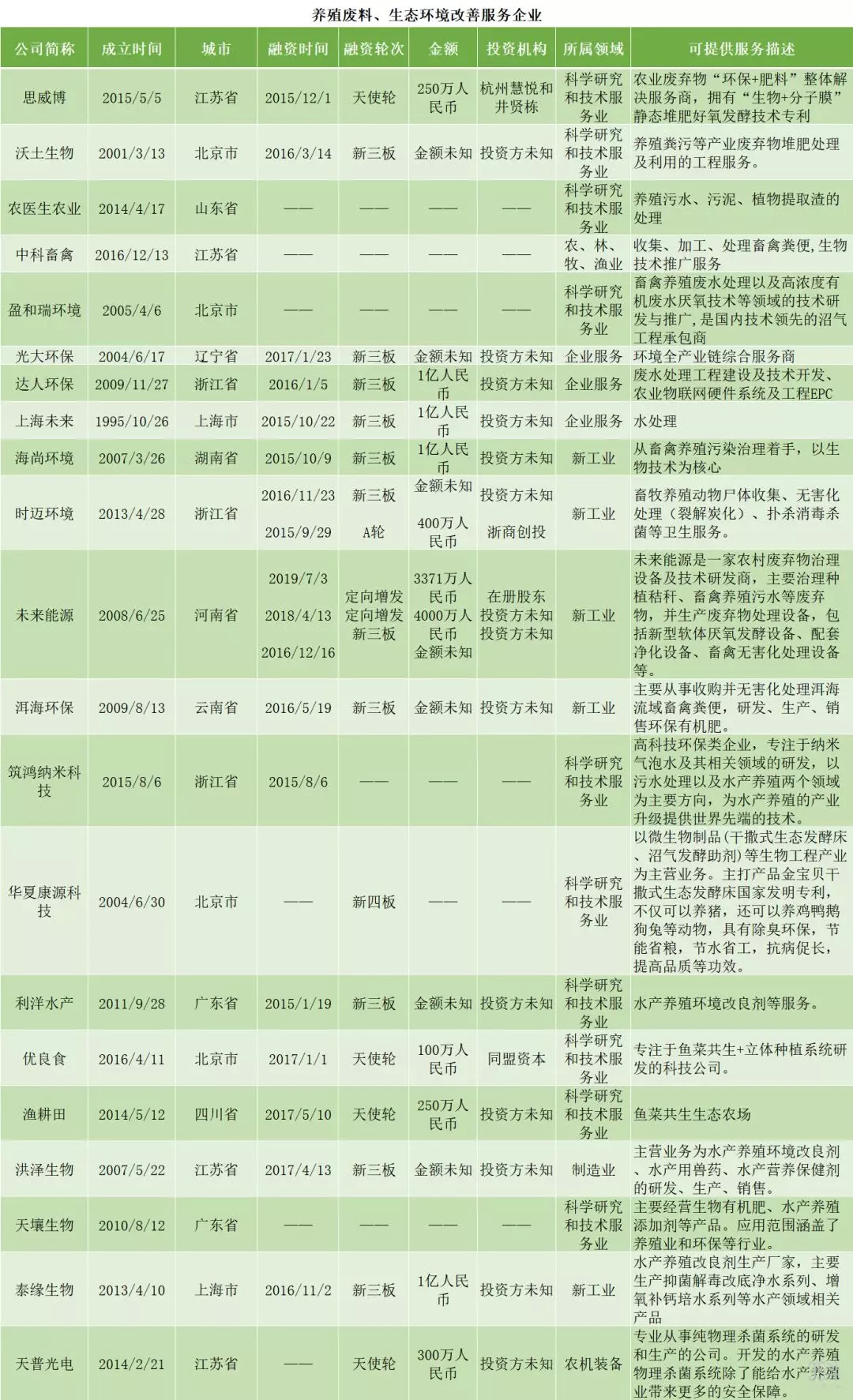 其中,环保类企业差不多都是新三板企业,集中成立时间在2010年之前。环境保护的需求由来已久,而畜禽污染是其中的痛点、难点,由此涉及到这方面的企业发展上将更有优势。
