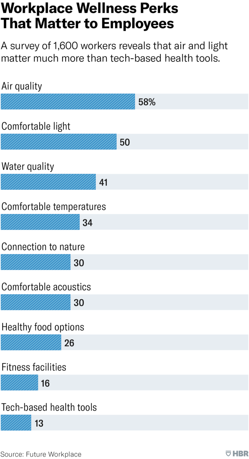 比起那些时髦、现代化的健康设施,更容易被人忽视的基本要素才是健康福利的关键。按照员工心中重要度依次排序为:空气质量(58%)、自然采光(50%)、水质(41%)、舒适的温度(34%)、办公室声音效果(30%)、亲近自然(30%)、可选择的健康食物(26%)、健康设施和基于技术的健康工具(16%和13%)。