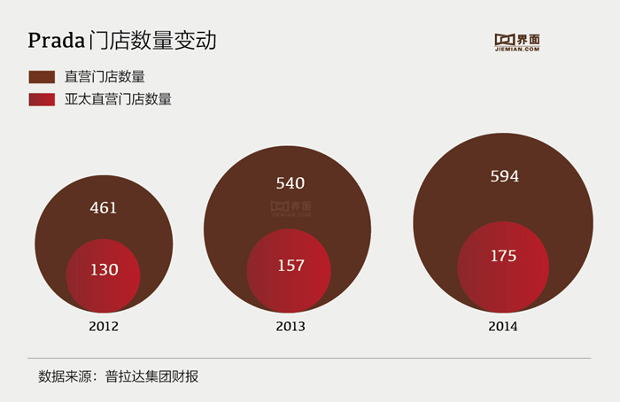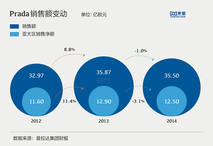 Prada在2013年勉强录得0.3%的利润增长,在全球79家新开店铺的销售推动下,集团营收上升8.8%。亚太地区新开了27家门店,销售净额的同比增幅仅为11.4%(2012年增幅达到35.6%)。