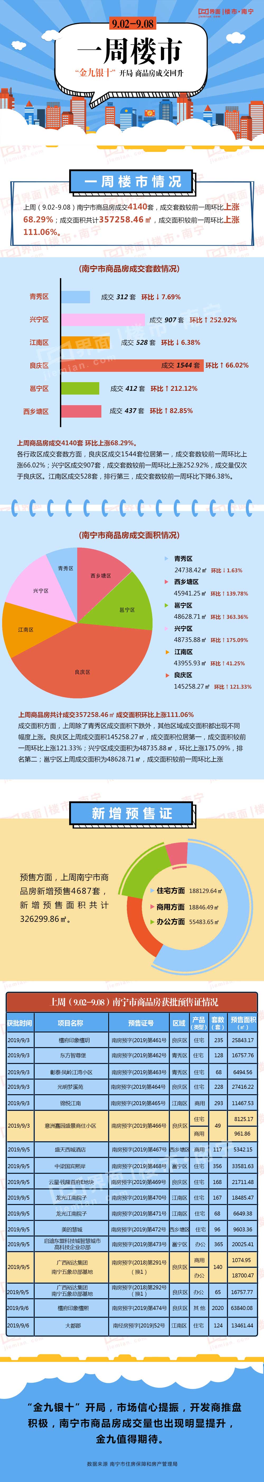 上周(9.02-9.08)南宁市商品房成交4140套,成交套数较前一周环比上涨68.29%;成交面积共计357258.46㎡,成交面积较前一周环比上涨111.06%。