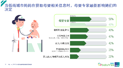 低线城市妈妈在获取母婴相关信息时,更相信专业建议。报告显示:56%的低线城市妈妈最信赖母婴专家推荐的内容,显著高于高线城市。