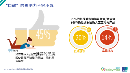 在下沉市场中,通过熟人社交来打造品牌口碑是一个重要的推广手段。45%的低线城市妈妈表示只要是家人/朋友推荐的品牌,即使自己不知道也愿意接受。同时,相较于高线城市,20%的低线城市妈妈表示从熟悉的微商/微信妈妈群/微信朋友圈购买过母婴产品。这些KOC的口碑影响力在低线城市妈妈中不容小觑。