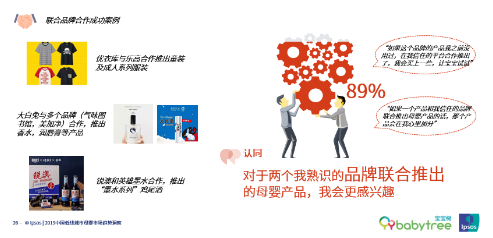 与此同时,在新零售与泛娱乐的大背景下,下沉市场的妈妈们也开始从产品消费逐步过度到精神消费,“好玩”正成为她们选购的标准之一。报告显示:89%的妈妈表示知名品牌的跨界合作在一定程度上能够激发她们的兴趣;64%的妈妈表示她们会购买自己或宝宝喜欢的动漫和影视剧相关的母婴产品。