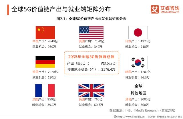 利好政策、技术进步和市场需求驱动下,全球主要经济体加速推进5G商用落地。iiMedia Research(艾媒咨询)发布的《艾媒报告|2019-2025全球5G产业发展趋势与商业应用模式研究报告》数据显示,预计2035年全球5G价值链产出将达到3.5万亿美元,在全球提供2176.4万个就业机会,其中,中、美、德、日韩的产出规模排名领先。