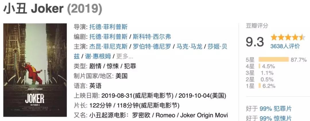 基于此,《小丑》自威尼斯电影节首映以来就获得海内外超高口碑。豆瓣评分开局9.7,此后虽然遭到“报复性一星”现象,但至今维持在9.3分。IMDB评分9.6,烂番茄86%新鲜度。在超级英雄电影中,这样的成绩甚至打破了由克里斯托弗·诺兰打造的《蝙蝠侠:黑暗骑士》。