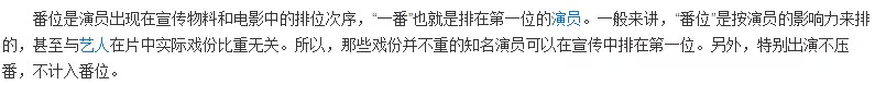 其实,番位之说也是个舶来品。它最早起源于日本,指的是演员出现在宣传物和影视剧演员表中的排位次序。