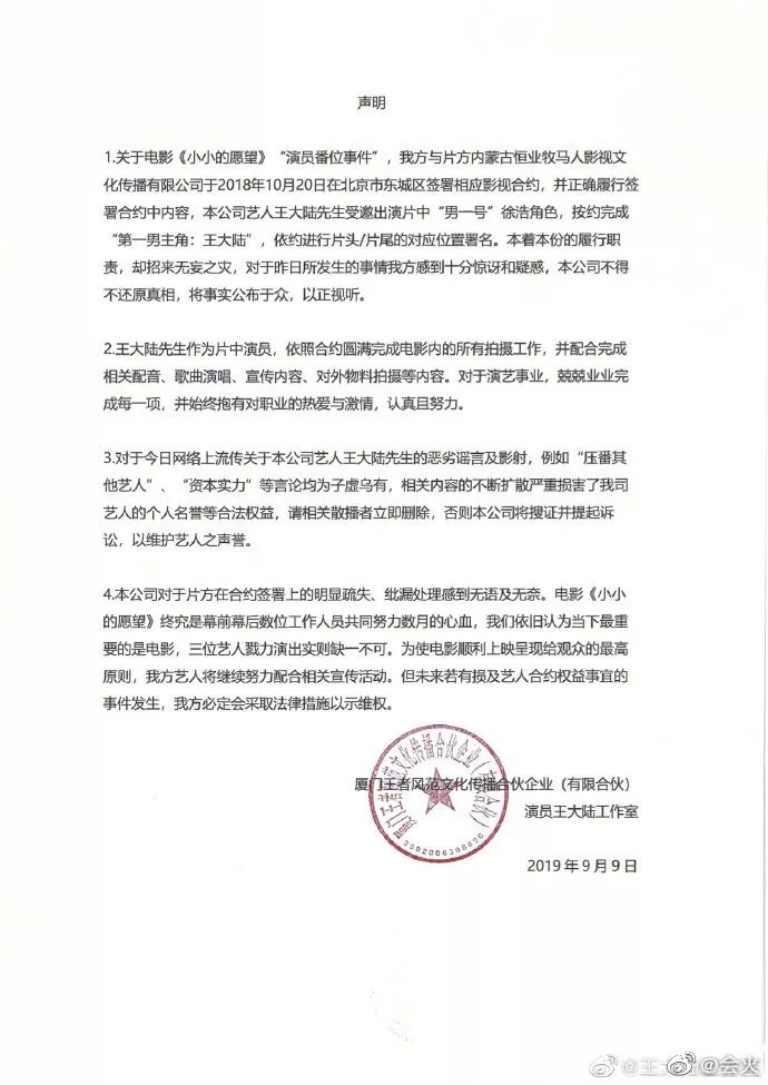 这不,最近由彭昱畅、王大陆、魏大勋领衔主演的电影《小小的愿望》还没上映,三篇声明就抢占了连续两天的热搜。
