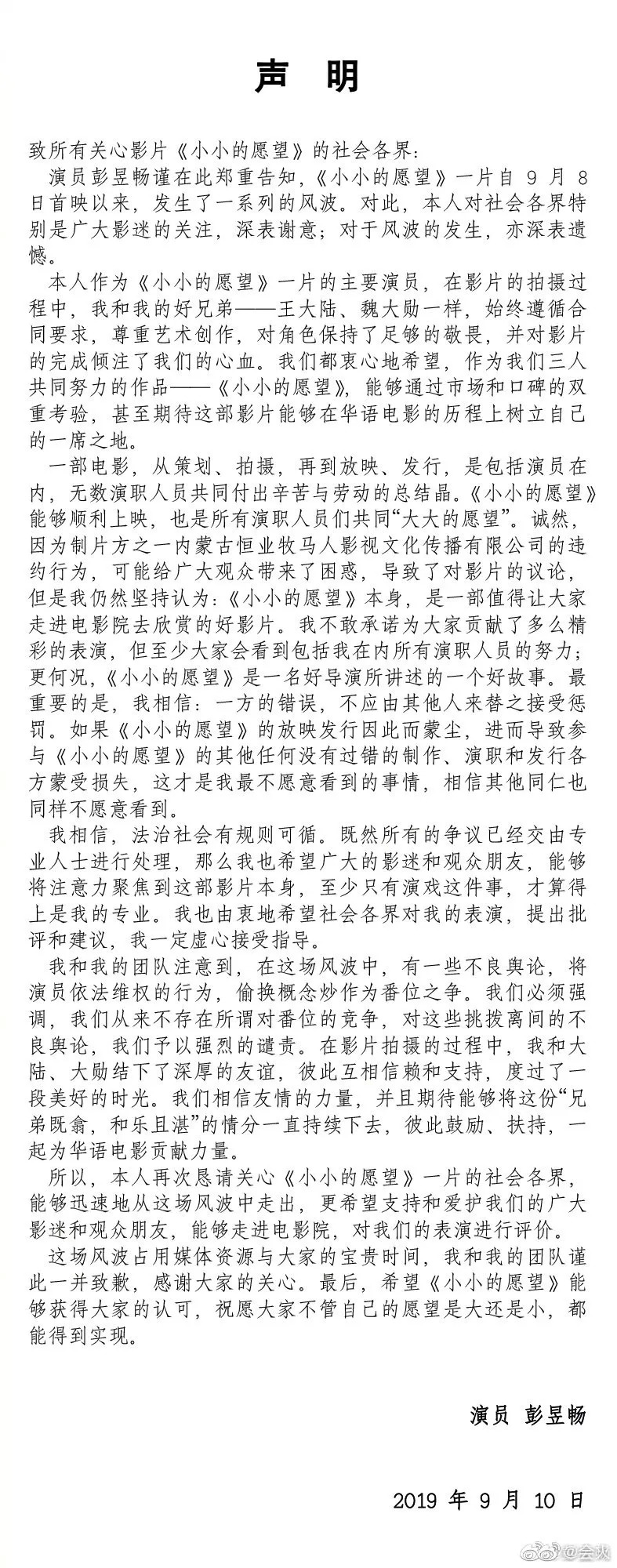 可万万没想到,另一边彭昱畅工作室官方微博发布了一则严正声明,称该片制片方违反合约。