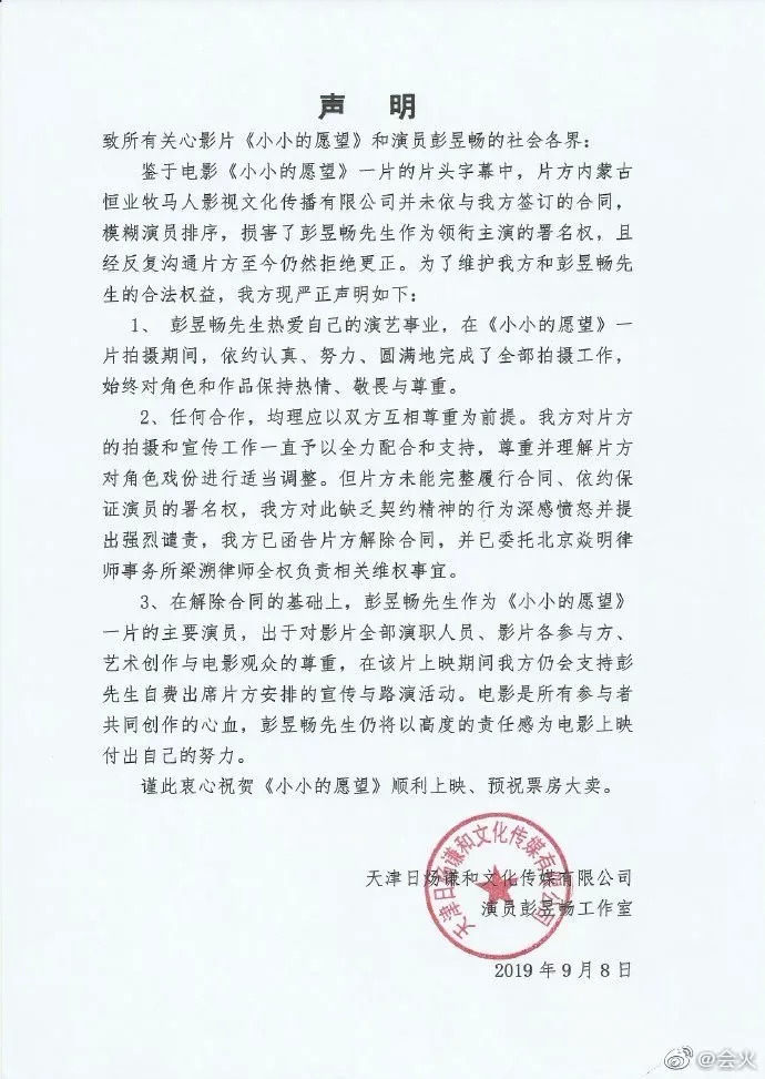 “模糊演员排序,损害了彭昱畅作为领衔主演的署名权,且经反复沟通片方至今仍然拒绝更正”,因此“已函告片方解除合约”。