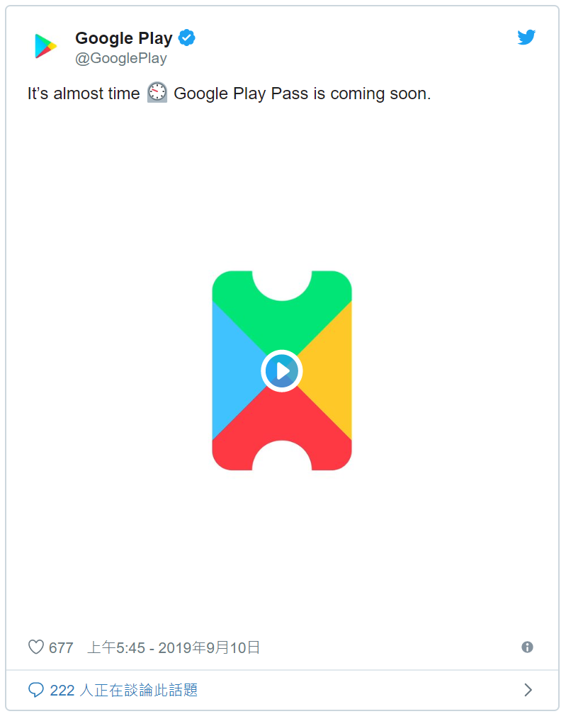不过,类似的服务安卓用户可能也不用等太久。根据 Google Play官方在推特上的预告影片显示,他们似乎准备好了一个名为Google Play Pass的服务,并预告这个服务即将登场。截止到目前为止,所有相关细节官方都尚未公布,但根据猜测,Google Play Pass应该就是针对Arcade而推出的Google Play新订阅服务。
