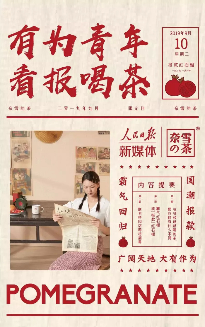 昨天,奈雪官方微信发文《奈雪x人民日报新媒体|有为青年 看报喝茶》,联名人民日报新媒体推出新品“报款”红石榴。