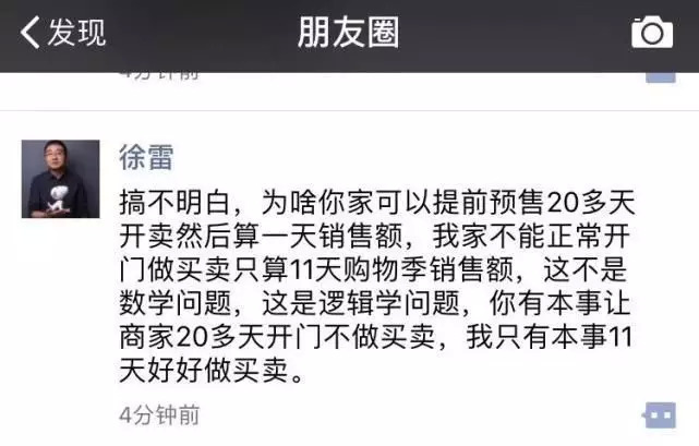 2017年“双11”交易完成之后,阿里宣布成交额达到1682亿元,随后京东也对外公布销售额达到了1271亿元。正当各路吃瓜群众还沉浸在剁手的喜悦中时,阿里、京东又向外界送来了一个大瓜,阿里巴巴公关委员会主席王帅暗指京东在该年“双11”统计的销售额数据有水分时表示,“不得不承认京东数学很好,只要京东自己愿意,可以把一年的下单金额都算成双十一跨年大活动的下单总额”。而京东首席营销官徐雷,也随后在在朋友圈做出相关回应,“这不是数学问题,是逻辑学问题。为啥你家可以提前预售20多天开卖然后算一天销售额,我家不能正常开门做买卖只算11天购物季销售额?”