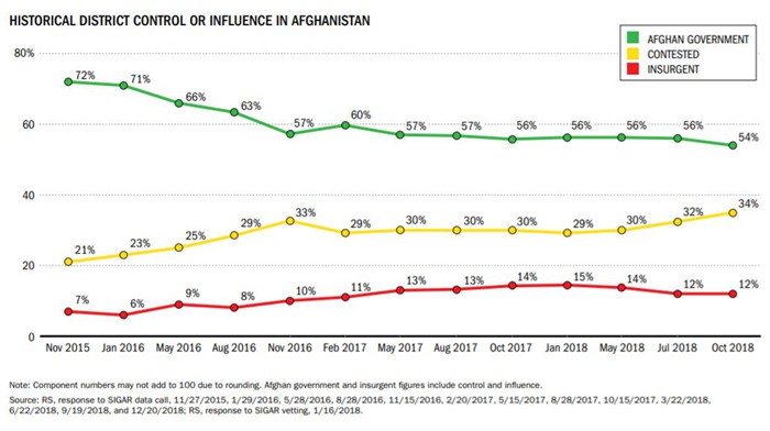 根据美国今年1月最后一次公布的阿富汗重建特别监察长季度报告,截至去年10月22日,阿富汗政府仅控制了全国53.8%的地区,比2017年同期减少了八个地区。