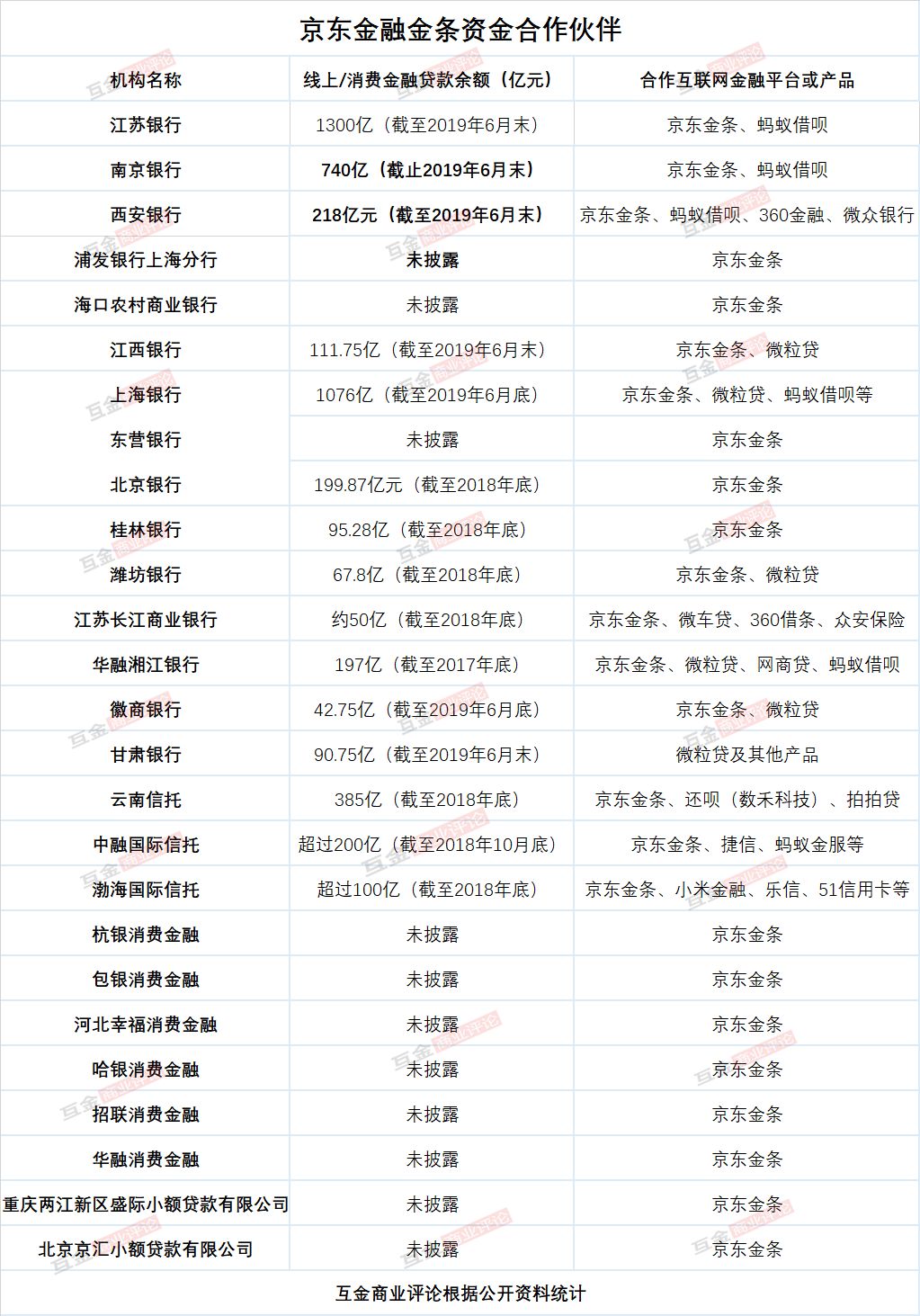 据互金商业评论不完全统计,京东金条的资金方包括银行、信托机构、持牌消费金融机构以及小贷公司。在互金商业评论统计的26家资金方中,银行有15家,包括西安银行、上海银行、江苏银行、浦发银行等;信托机构3家,分别为云南信托、中融信托和渤海信托。消费金融机构有6家,包括哈银消费金融、华融消费金融等。小贷公司则主要是京东旗下的两家机构:重庆两江新区盛际小额贷款有限公司与北京京汇小额贷款有限公司。