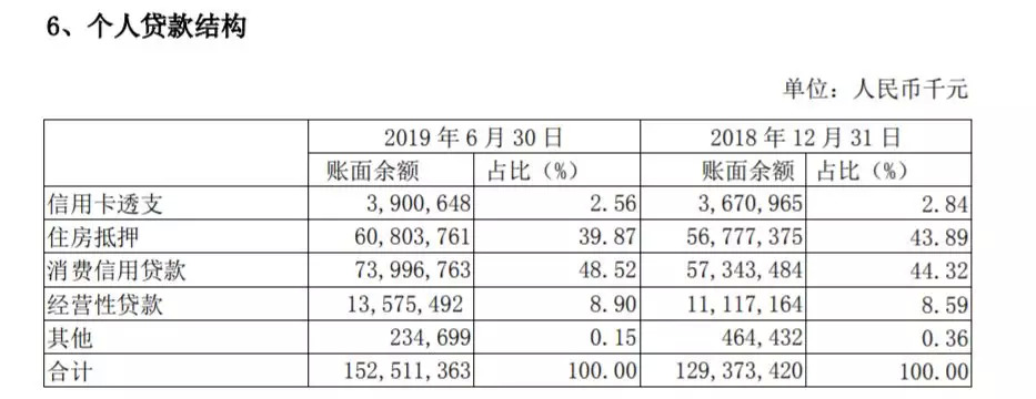 南京银行个人信贷业务品种较多,目前已经推出信易贷、房易贷、诚易贷、你好e贷等。其中,线上信用贷款以自有品牌“你好e贷”为主,该产品全线上审批,主要面向22-45周岁的客户,贷款可用于装修、购车、旅游等消费。截至2019年6月末,南京银行消费信用贷款余额740亿元,比去年同期(573亿元)增长了29%。