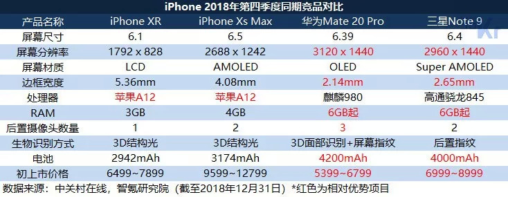 对比iPhone XR/Xs系列的同时期竞品可知,iPhone系列产品的技术优势其实已经在逐步减弱。就配置来说,同时期的华为Mate 20 Pro和三星Note 9在边框宽度、屏幕分辨率、RAM容量、后置摄像头、电池容量等多个方面都已经超过了iPhone XR/Xs系列,但其价格却远低于后者。