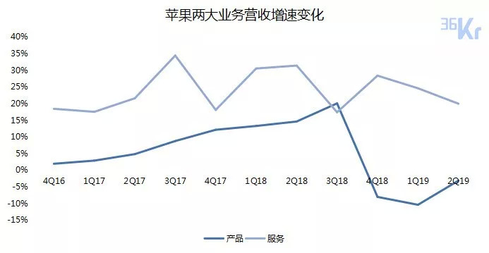 苹果的转折点发生在2018年第四季度,在此之前苹果借由新iPhone的发布,连续两年高歌猛进,营收增速由2016年第四季度的3%不断提高至2018年第三季度的20%,加速是这个时期苹果的代名词。然而,在XR/Xs发布后的2018年第四季度,苹果开始陷入泥潭,营收增速迅速从上季度的20%下降至-5%,直到今年第二季度才开始缓慢复苏,但较此前的盛况相比却依然稍显凄凉。