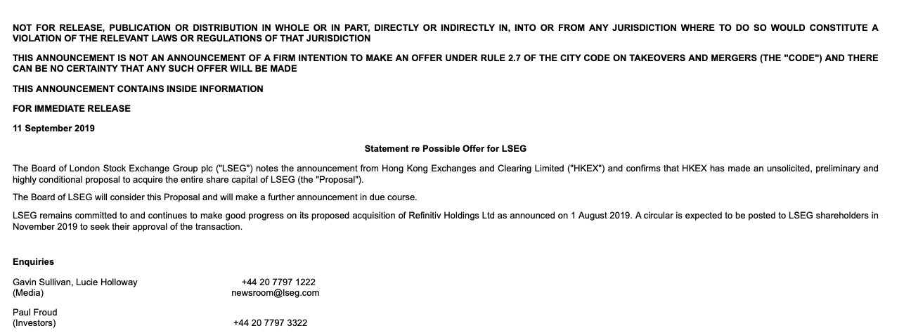 针对港交所提出的合并要约,伦交所官方在第一时间作出了回应。