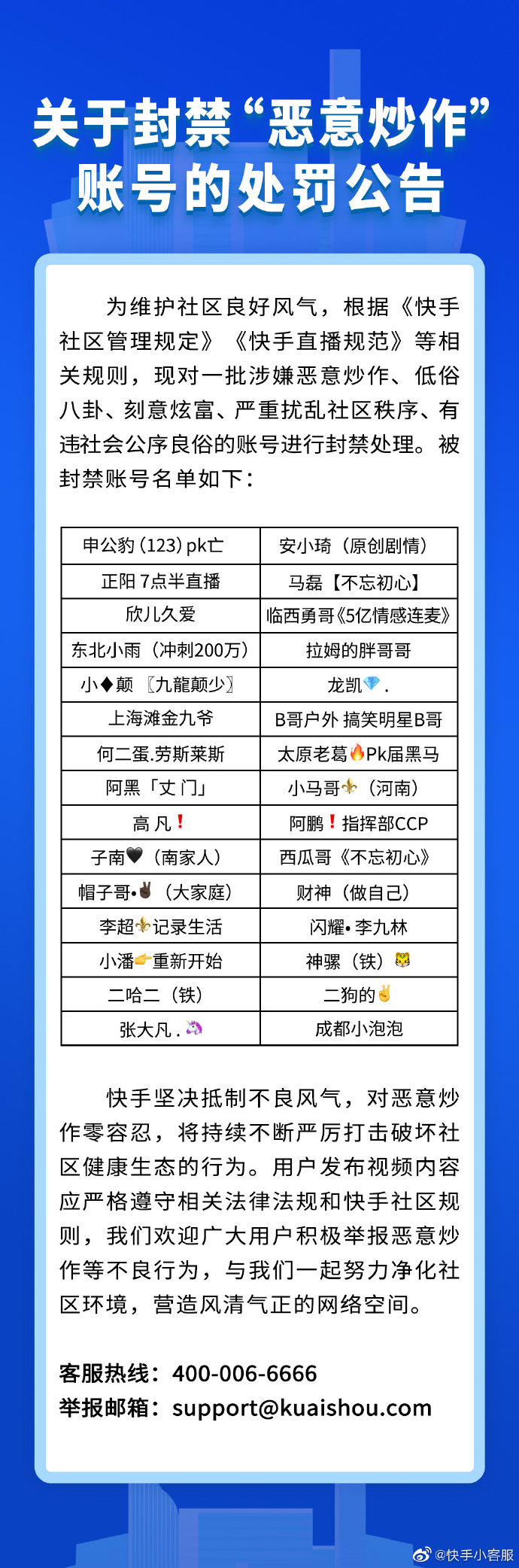 9月11日,快手官方客服发布关于封禁“恶意炒作”账号的处罚公告,对一批涉嫌恶意炒作、低俗八卦、刻意炫富、严重扰乱社区秩序、有违社会公序良俗的账号进行封禁处理。