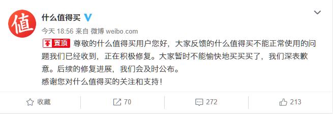当日晚19时,什么值得买官微回应称,“大家反馈的什么值得买不能正常使用的问题我们已经收到,正在积极修复。大家暂时不能愉快地买买买了,我们深表歉意。后续的修复进展,我们会及时公布。”