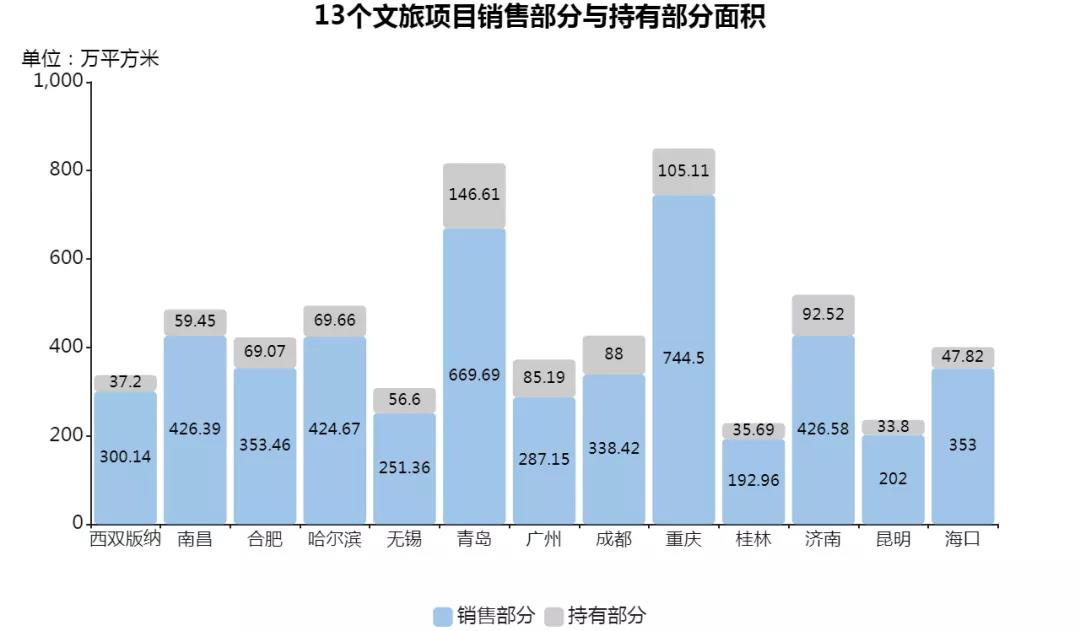 据财报披露,13个文化旅游项目总建筑面积合计约为5897.05万平方米,其中,自持面积约为927万平方米,可售面积约为4970万平方米,可售面积约占总建筑面积的84%。经过计算得知,收购过来的万达文旅项目,约80%的土地储备将会被出售。