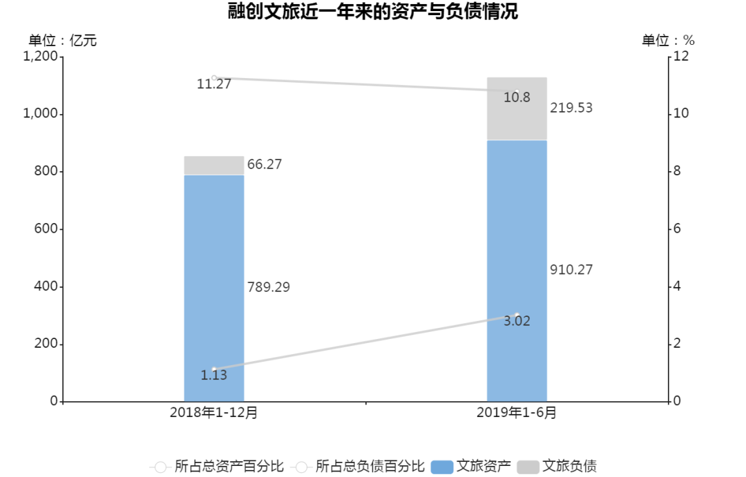 据2019年中期业绩公告披露,于2019年6月30日,文旅城建设及运营分部资产总额约为人民币910.27亿元(约占总资产的10.80%),负债约为人民币219.53亿元(约占总负债的3.02%)。而去年年底的资产约为789.30亿元,负债约为66.27亿元,同比分别上升15.33%和231.27%。