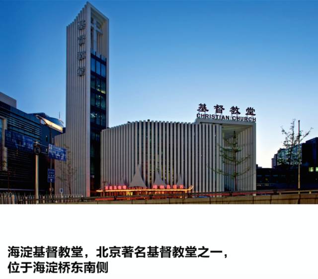 海淀基督教堂,北京著名基督教堂之一,位于海淀桥东南侧,一座现代化风格的建筑,大门中间竖着大大的十字架,静谧、肃穆。每年圣诞节这里都人满为患,前美国国务卿希拉里·克林顿2009年访华时曾经去做过弥撒。