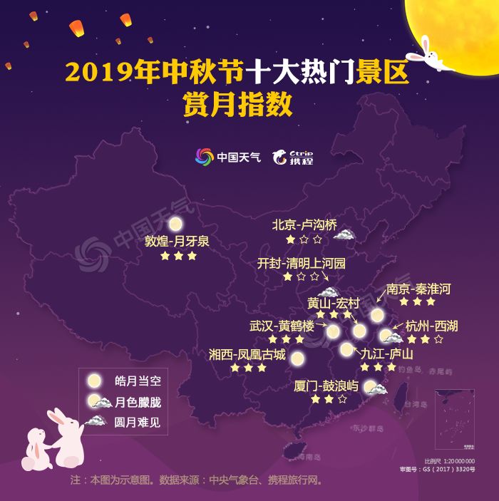 中国天气网联合携程发布的《2019年中秋节出行和赏月报告》显示:杭州西湖、黄山宏村、卢沟桥、南京秦淮河、庐山、开封清明上河园、武汉黄鹤楼、厦门鼓浪屿、凤凰古城、敦煌月牙泉将是今年中秋出游的十大热门景区。